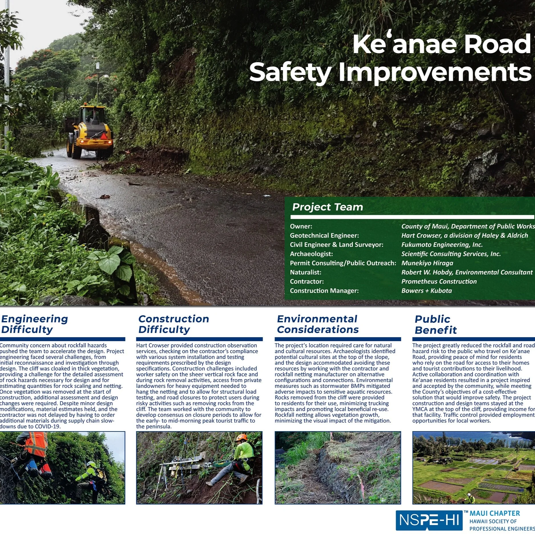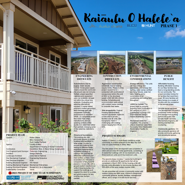Each year, the Hawaii Society of Professional Engineers (HSPE) - Maui Chapter facilitates a Project of the Year competition to help highlight infrastructure projects beneficial to Maui County. Many industry leaders participate and submit projects that are reviewed and evaluated on the following criteria: